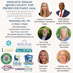 The 2nd Annual Top Producer Panel, Insights from Indian River County Real Estate Pros took place at the prestigious Riverside Theatre on November 5th, 2025. With six top producing agents from different offices on stage, the packed room of fellow realtors enjoyed a delightful lunch while panelists shared their answers.